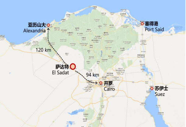 萨达特位于开罗和亚历山大城之间、尼罗河三角洲的外边缘、75号高速公路北侧,距离亚历山大约120公里、距离开罗约94公里,距开罗国际机场约105公里——国内外交通便利,有利于项目未来开展国际贸易。