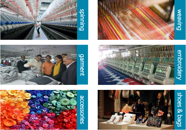产业园按照?上下游产业链完整、关联产业配套齐全?的总体思路布局,逐步形成纺纱、织布、印染、洗水、成衣制造、绣花、印花、辅料、鞋帽箱包等生产及贸易,仓储物流、电子商务等关联产业(生活、教育、医疗、金融、会展、酒店、办公、研发等)融合发展的产业格局,形成产业聚集、人与产业联动的新型现代化产业园区。