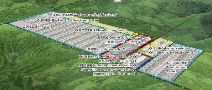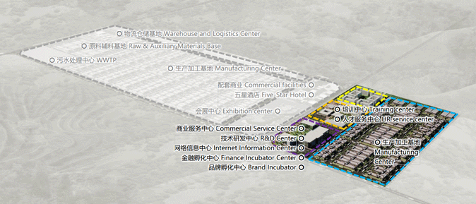 主要设置生产加工基地、原辅材料基地、培训中心、人才服务中心、技术研发中心、仓储物流中心、会展中心、品牌孵化中心、金融孵化中心、商务服务中心、纺织服装行业网络信息服务中心、五星级酒店等功能区。