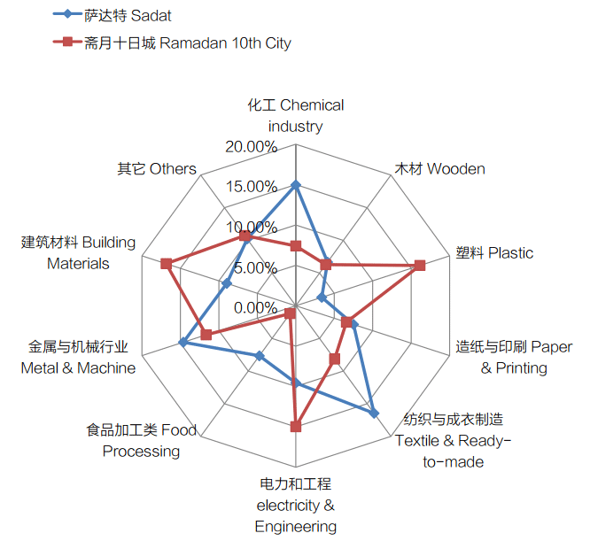 其中,萨达特工业城和斋月十日城的产业链涉及较为广泛;在食品加工类、金属和机械行业类、建筑材料类、电力工程类、纺织与成衣制造类、造纸与印刷类、塑料类、木材类、化工类等都有成熟的企业。