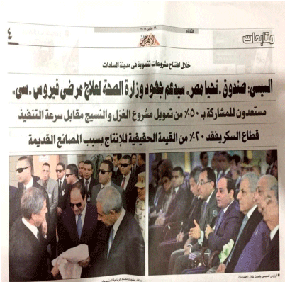 埃及主流媒体《金字塔报》头版头条报道中埃·曼凯纺织产业园项目。