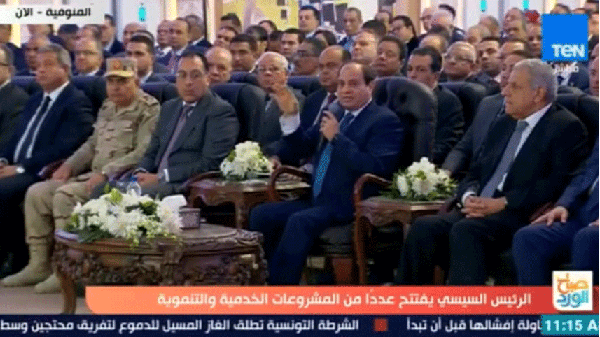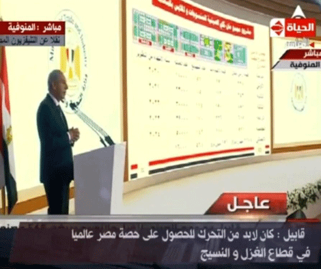 图为1月15日在总统考察萨达特市时,贸工部长为总统介绍曼凯纺织产业园项目的现场直播。 埃及电视台《生活》、《尼罗河》等多个频道都进行了现场直播。